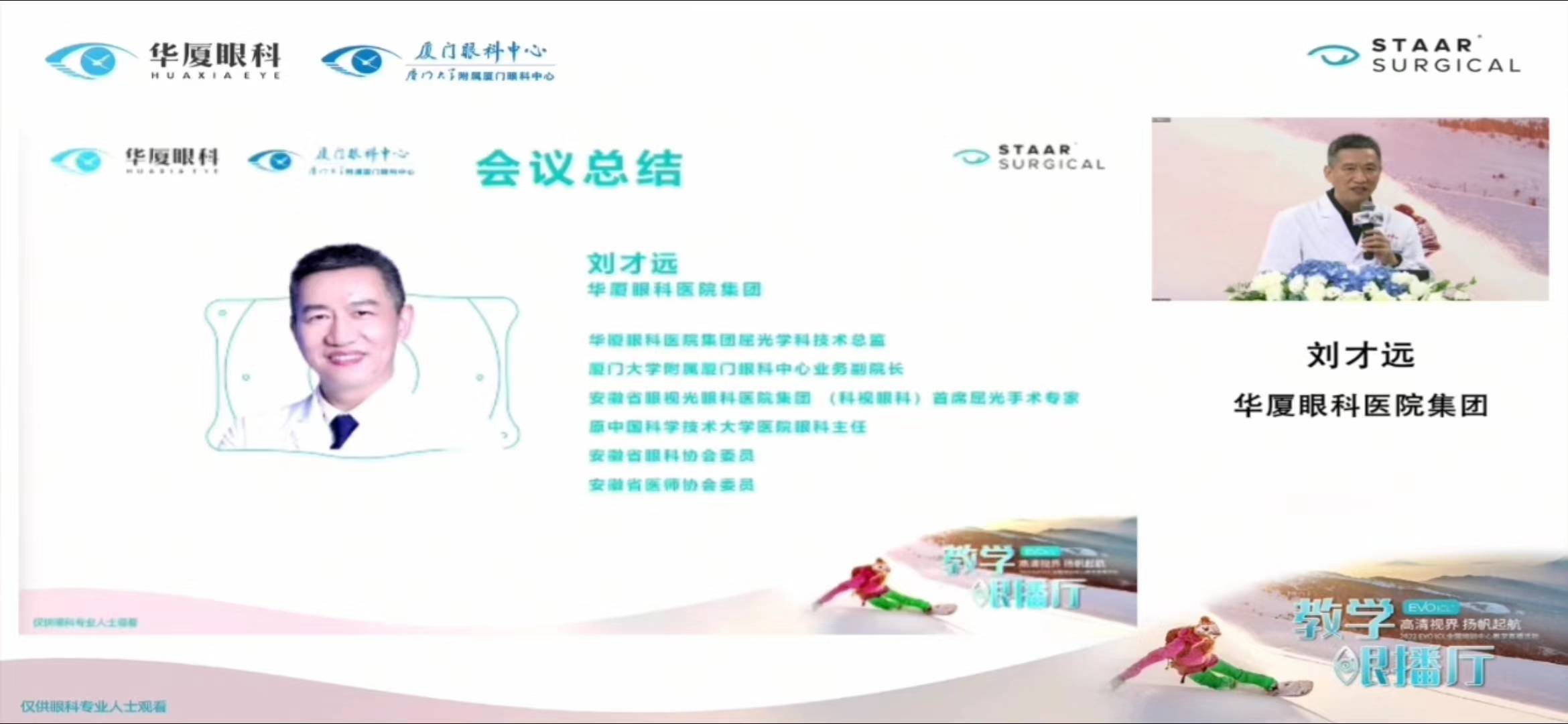 廈門眼科中心業(yè)務(wù)副院長劉才遠(yuǎn)進(jìn)行了總結(jié)。他表示,通過教學(xué)眼播廳這種新穎的教學(xué)形式,各ICL手術(shù)專家為我們呈現(xiàn)了一期精彩的教學(xué)課程和振奮人心的手術(shù)直播,使得全國ICL手術(shù)醫(yī)生有所收獲、有所成長。我們期待加快青年ICL手術(shù)醫(yī)生的成長,一起推動中國屈光手術(shù)的高質(zhì)量發(fā)展。