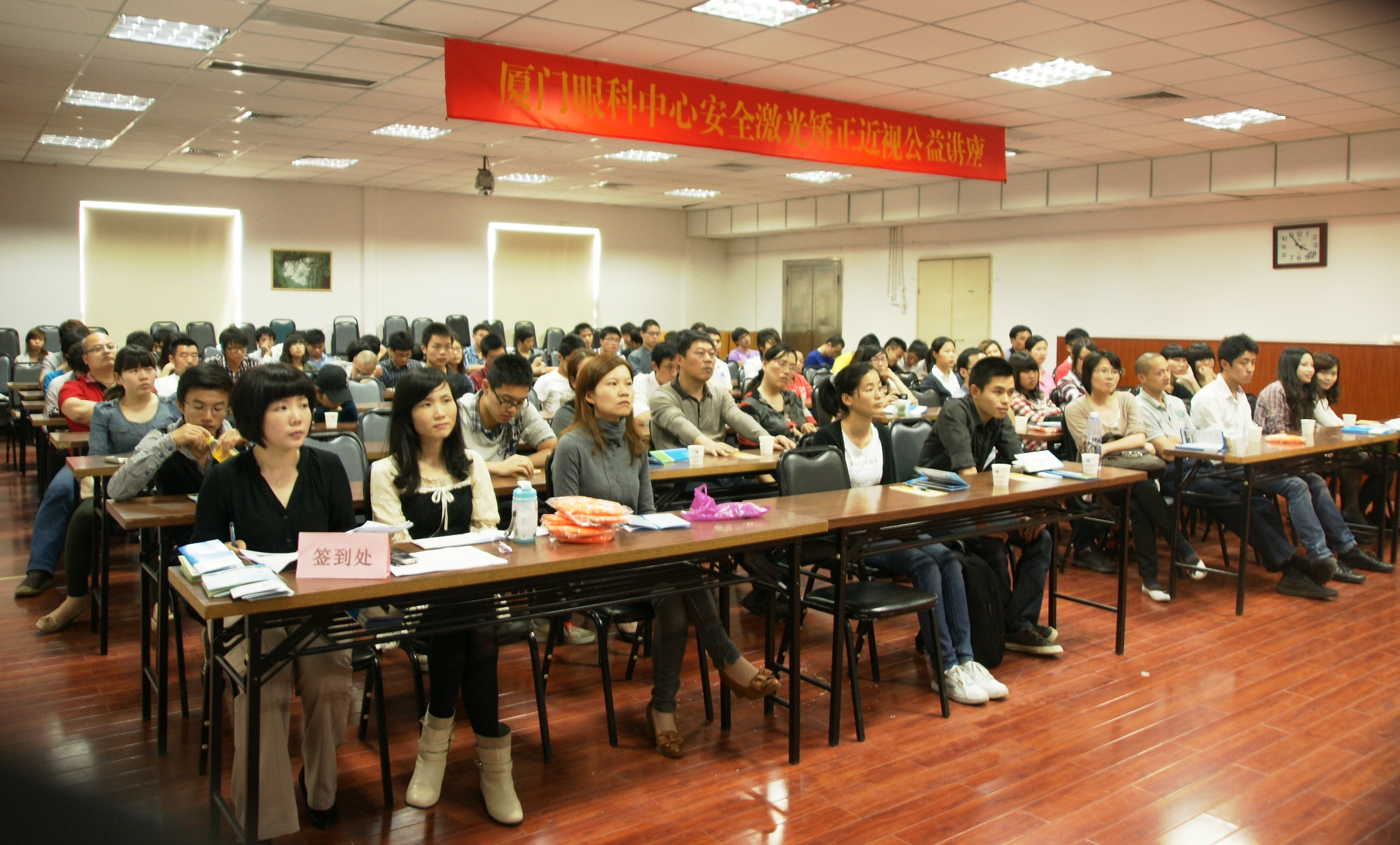 第三期講座由視光科副主任醫(yī)師揭黎明開講,現場吸引了近百個近視患者前來參加。會上大家踴躍提問,對于最近頗受關注近視手術的是否有并發(fā)癥等問題揭主任都進行了一一解答。很多人通過聽課并向專家咨詢打消了手術疑慮,聽眾當中有近40%都報名確定了手術時間。