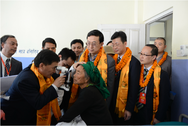 術(shù)前,姚曉明博士為患者檢查,確定術(shù)式。專程從90公里以外的首都加德滿都趕來出席光明行啟動(dòng)儀式的吳春太大使(右三)到病房慰問患者和醫(yī)務(wù)人員。