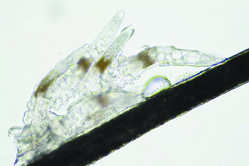 顯微鏡下長在睫毛中的螨蟲