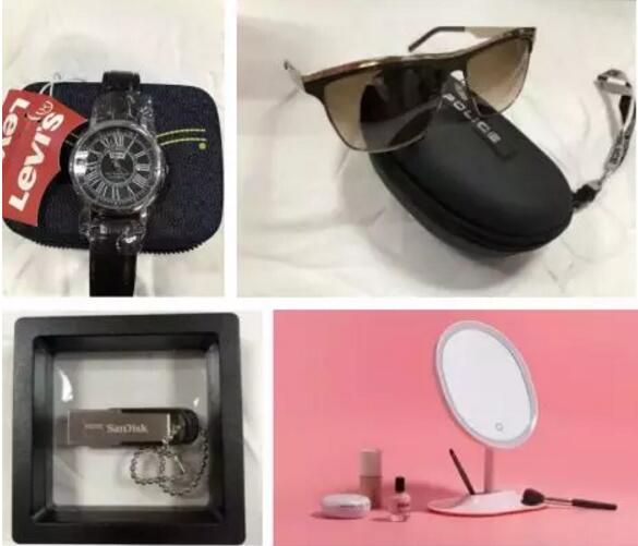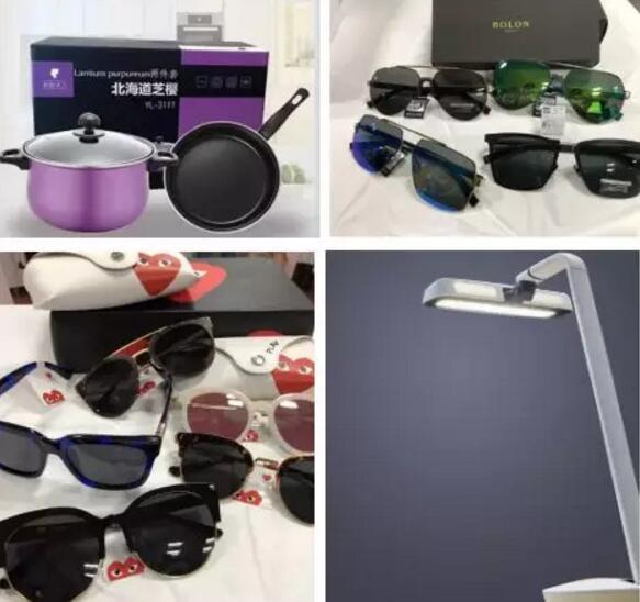 價值1980元的警察太陽鏡、價值598元的豪華鍋具、價值798元的暴龍?zhí)栫R、價值680元的李維斯手表、價值398元的艾尼雅太陽鏡和川久保玲太陽鏡、價值188元的魔法化妝鏡、價值168元護眼臺燈、價值150元U盤、價值108元進口高檔毛巾……