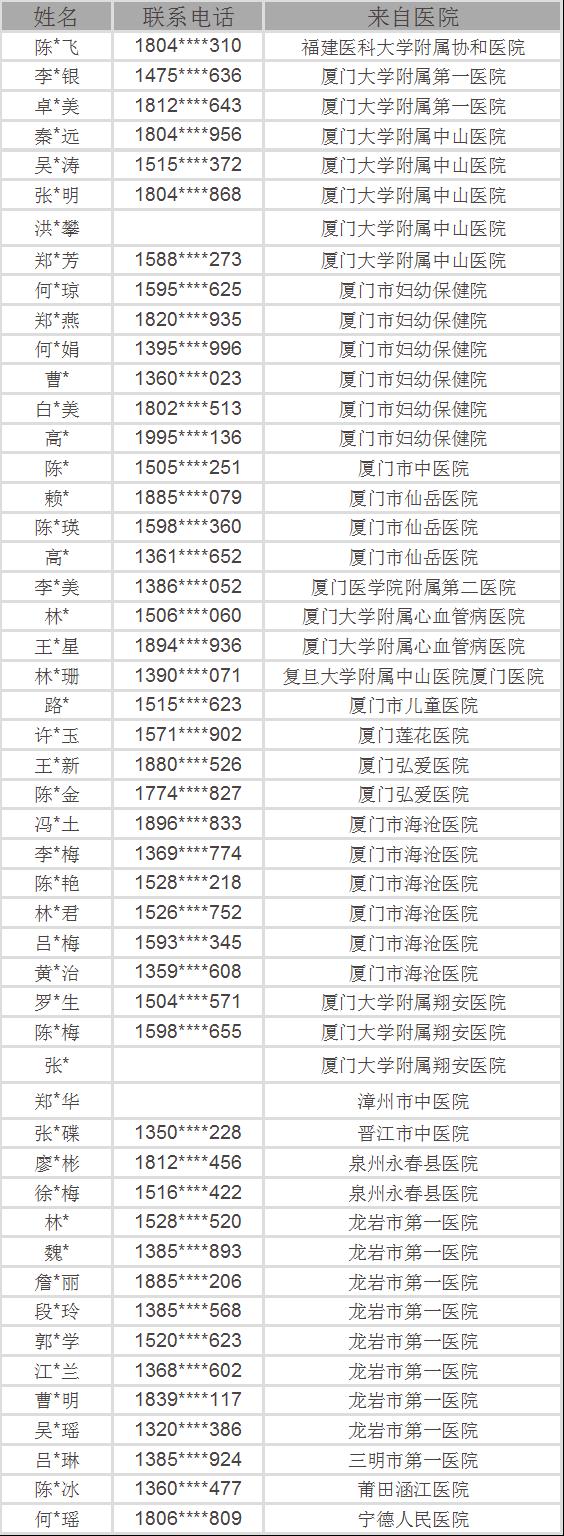 經(jīng)過審核完成后,廈門13家醫(yī)院34名醫(yī)護人員、福州1家醫(yī)院1名醫(yī)護人員、漳州1家醫(yī)院1名醫(yī)護人員、泉州2家醫(yī)院3名醫(yī)護人員、龍巖1家醫(yī)院8名醫(yī)護人員、三明1家醫(yī)院1名醫(yī)護人員、莆田1家醫(yī)院1名醫(yī)護人員、寧德1家醫(yī)院1名醫(yī)護人員獲得了免費手術(shù)資格。名單公示如下: