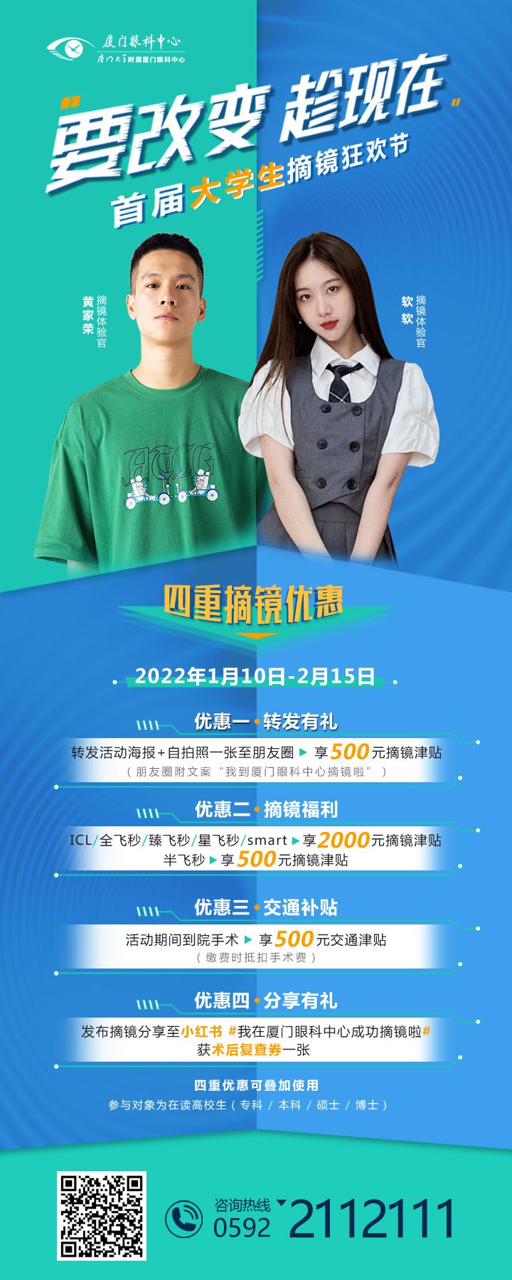 守護(hù)光明,溫暖助力【文章導(dǎo)讀】2022年1月10日-2月15日 廈門眼科中心 大學(xué)生摘鏡狂歡節(jié) 席卷卷卷卷而來(lái) 四重摘鏡福利 丟掉眼鏡 丟掉煩惱 要改變 趁!現(xiàn)!在! 讓我們一起做 新時(shí)代有才有為有顏值的高知分子吧 活動(dòng)時(shí)間: