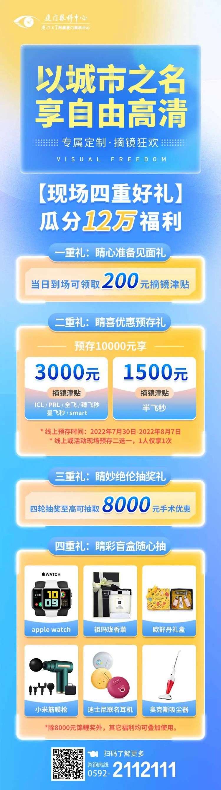 現(xiàn)場預存10000元,ICL/PRL/全飛秒/臻飛秒/星飛秒/Smart 即享3000元摘鏡津貼;半飛秒享1500元摘貼。