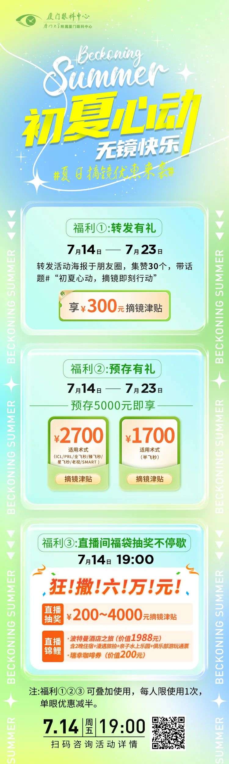 7月14日19:00,觀看直播,抽 200元至4000元 摘鏡津貼,更有瑞幸禮品卡、廈門五星波特曼酒店住宿券等好禮相送。