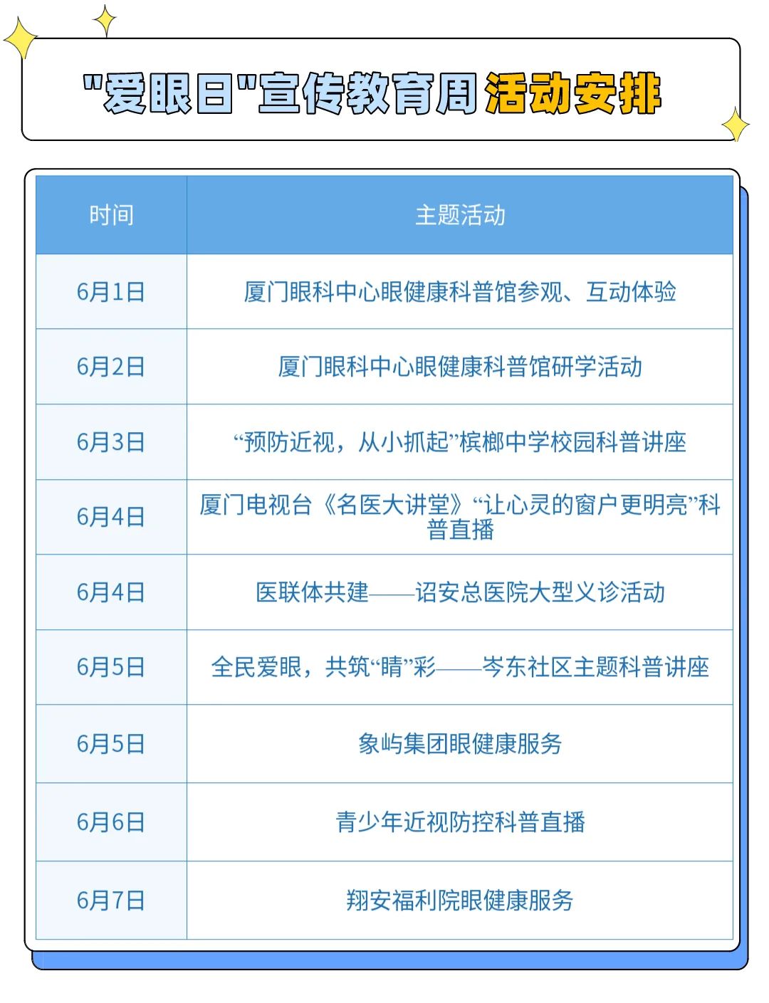 六月愛眼月期間,廈門眼科中心依托八大亞??频膶I(yè)實力,計劃將開展八大亞??蒲劢】悼破罩辈ズ桶賵龉嬖\療活動,并將制作百期科普視頻,廣泛布局科普宣傳渠道,大力宣傳全年齡段全生命周期眼健康的重要意義。期望通過系列活動助力加強眼病早期篩查、推行眼健康科普宣傳,提升人民群眾的疾病認知水平,推動眼病預防關口前移。