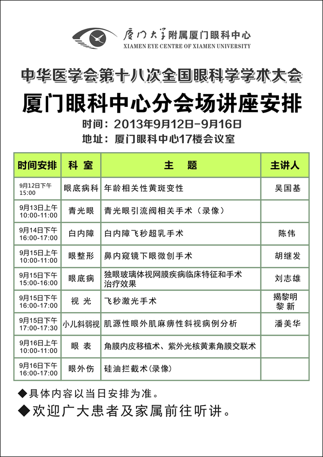 廈門眼科中心作為大會(huì)指定手術(shù)直播醫(yī)院,更是備受關(guān)注。學(xué)術(shù)大會(huì)期間,廈門眼科中心將作為分會(huì)場,展開一系列講座。具體安排如下: