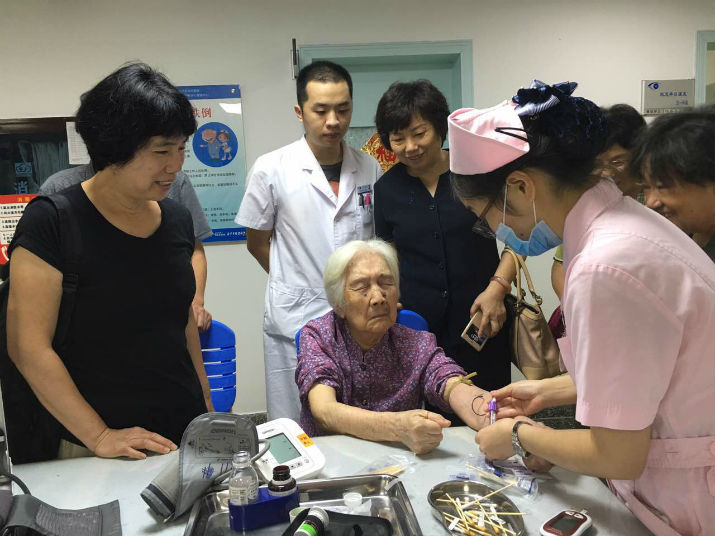 護(hù)士給葉奶奶做術(shù)前檢查,抽血、滴眼液、量身高、體重、測血壓等。