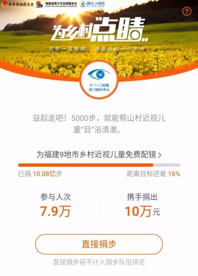 線上,以微信計步為支撐,鼓勵大眾走出辦公間,離開手機電腦,到戶外行走,在保護自己眼睛的同時,將步數(shù)捐出幫助鄉(xiāng)村孩子“點亮眼睛”;同時開設捐款快速通道: