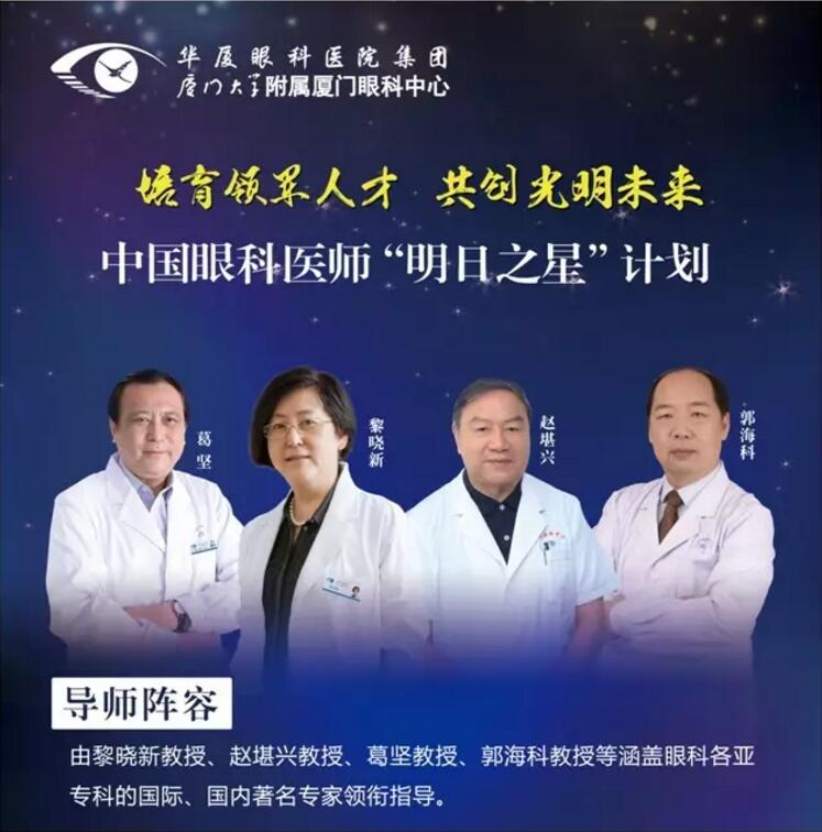 中國(guó)眼科醫(yī)師“明日之星”計(jì)劃由廈門(mén)大學(xué)附屬?gòu)B門(mén)眼科中心總院長(zhǎng)、國(guó)際眼科科學(xué)院院士、中華醫(yī)學(xué)會(huì)眼科學(xué)分會(huì)原主任委員、北京大學(xué)人民醫(yī)院原副院長(zhǎng)黎曉新教授,華廈眼科醫(yī)院集團(tuán)專(zhuān)家委員會(huì)主席、國(guó)際眼科科學(xué)院院士、亞太地區(qū)斜視與小兒眼科學(xué)會(huì)副主席、中華醫(yī)學(xué)會(huì)眼科學(xué)分會(huì)前任主任委員、中國(guó)醫(yī)師協(xié)會(huì)眼科醫(yī)師分會(huì)會(huì)長(zhǎng)趙堪興教授,華廈眼科醫(yī)院集團(tuán)戰(zhàn)略發(fā)展與學(xué)術(shù)委員會(huì)主任、中華醫(yī)學(xué)會(huì)眼科學(xué)分會(huì)名譽(yù)主任委員、原中山大學(xué)中山眼科中心主任暨眼科醫(yī)院院長(zhǎng)葛堅(jiān)教授,中華醫(yī)學(xué)會(huì)眼科學(xué)分會(huì)專(zhuān)家會(huì)員、華廈眼科醫(yī)院集團(tuán)業(yè)務(wù)副總院長(zhǎng)、廈門(mén)大學(xué)附屬?gòu)B門(mén)眼科中心業(yè)務(wù)院長(zhǎng)、上海和平眼科醫(yī)院院長(zhǎng)郭??平淌诘冉倜T士、博士研究生導(dǎo)師組成強(qiáng)大的導(dǎo)師陣容。