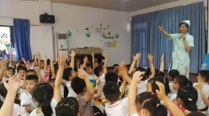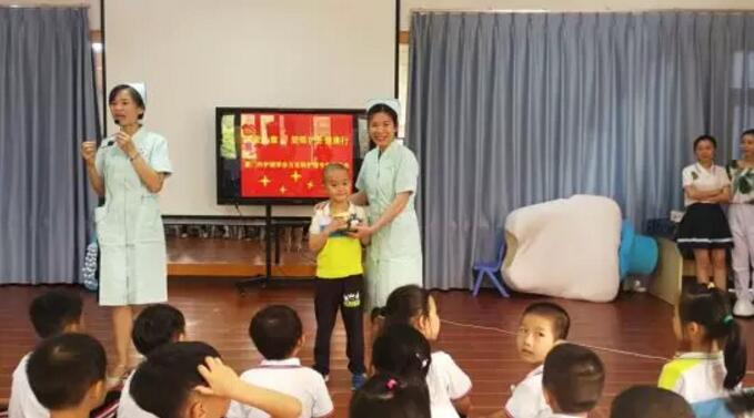在廈門大學(xué)附屬廈門眼科中心屈光中心護士長陳美珠帶領(lǐng)下, 5名護理人員走進廈門市警備區(qū)幼兒園,為123名可愛活潑的孩子送去護眼健康科普知識講座及視力檢查等活動。