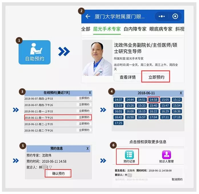?、?點擊進入“自助預(yù)約”——選擇相關(guān)科室&專家——點擊“立即預(yù)約”,選定就診日期及時間—“確認(rèn)提交“后即預(yù)約成功。(預(yù)約成功后,可在“預(yù)約記錄”查看排隊掛號情況,憑掛號證件和掛號短信到院取號可直接就診。)