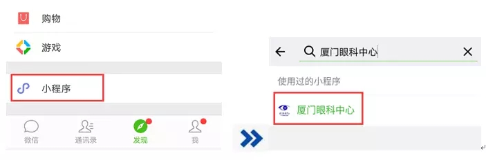 通過“發(fā)現(xiàn)”—“小程序”搜索“廈門眼科中心”,一鍵點擊進入。