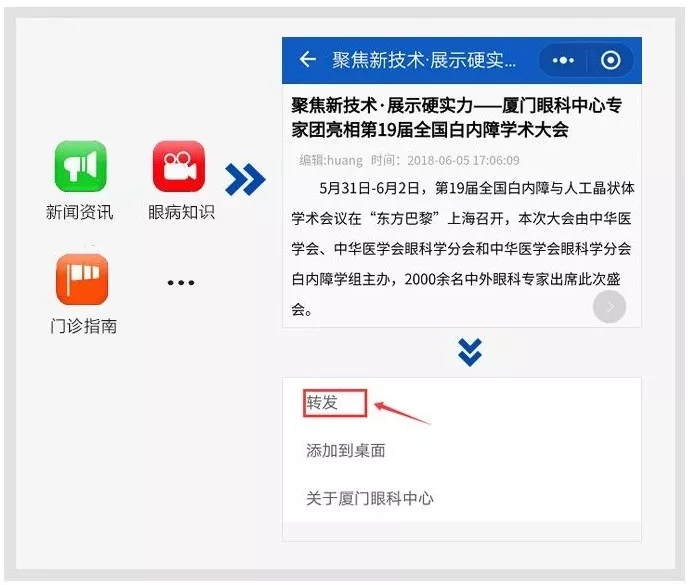 點擊小程序的“新聞動態(tài)”“媒體報道””“惠民活動”等選項,隨時隨地暢快瀏覽當(dāng)下眼科最新動態(tài)、不定時優(yōu)惠活動、愛眼護眼常識……,還能一鍵分享好文章。