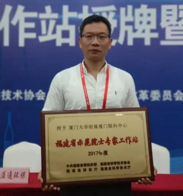眼科醫(yī)院集團副總裁李曉峰作為代表上臺領(lǐng)獎,捧回了“福建省示范院士專家工作站”獎牌。