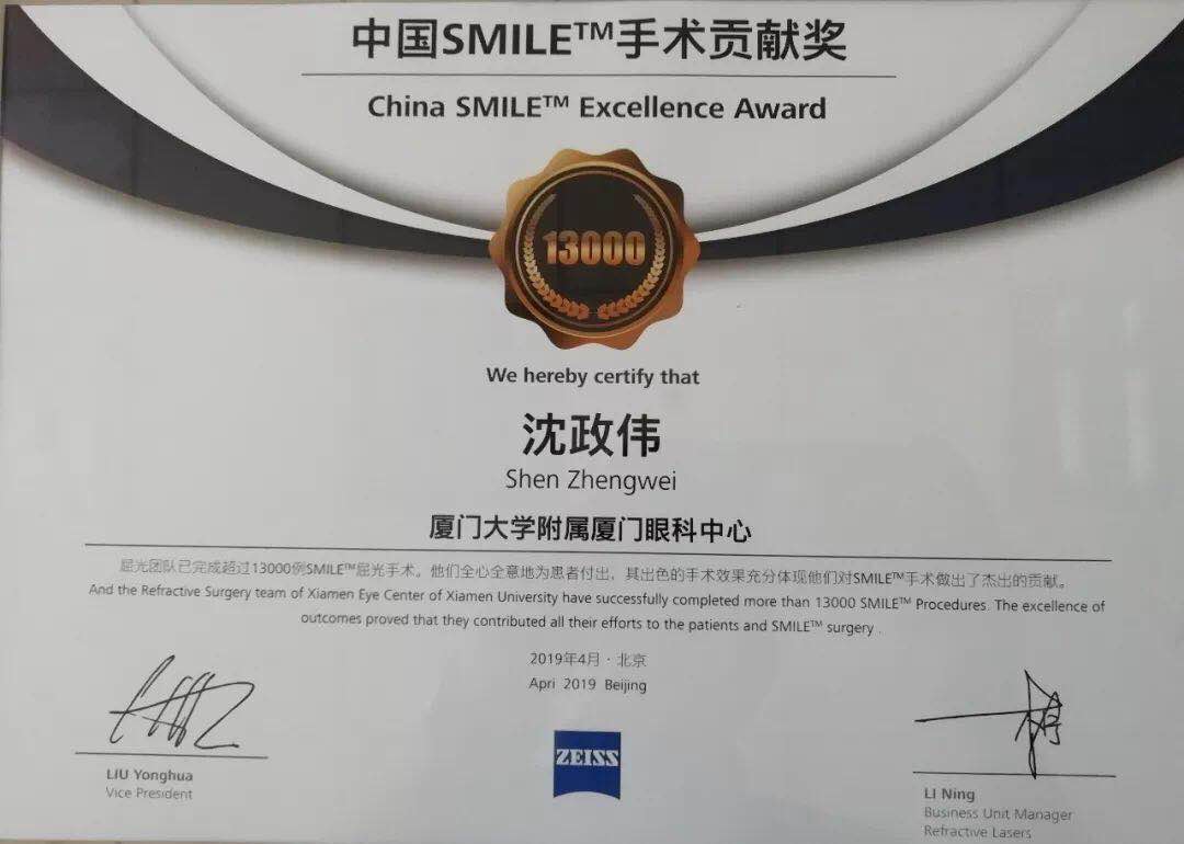 沈政偉院長(zhǎng)榮獲“中國(guó)SMILE™手術(shù)貢獻(xiàn)獎(jiǎng)”