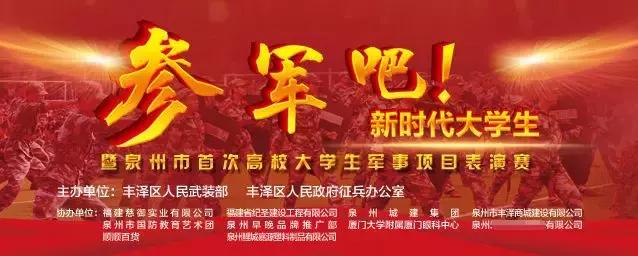 2019年5月25日,由泉州市豐澤區(qū)人民武裝部,豐澤區(qū)人民政府征兵辦公室主辦,廈門大學(xué)附屬廈門眼科中心協(xié)辦的《參軍吧!新時(shí)代大學(xué)生暨泉州市首次高校大學(xué)生軍事項(xiàng)目表演賽》在泉州市豐澤廣場(chǎng)舉行。表演賽吸引了泉州師范學(xué)院,泉州黎明職業(yè)大學(xué),福建電力職業(yè)技術(shù)學(xué)院,華僑大學(xué)等高校學(xué)生代表團(tuán),以及市民近千人,還有網(wǎng)絡(luò)、電視等130多家媒體通過現(xiàn)場(chǎng)直播或在線直播形式參加。