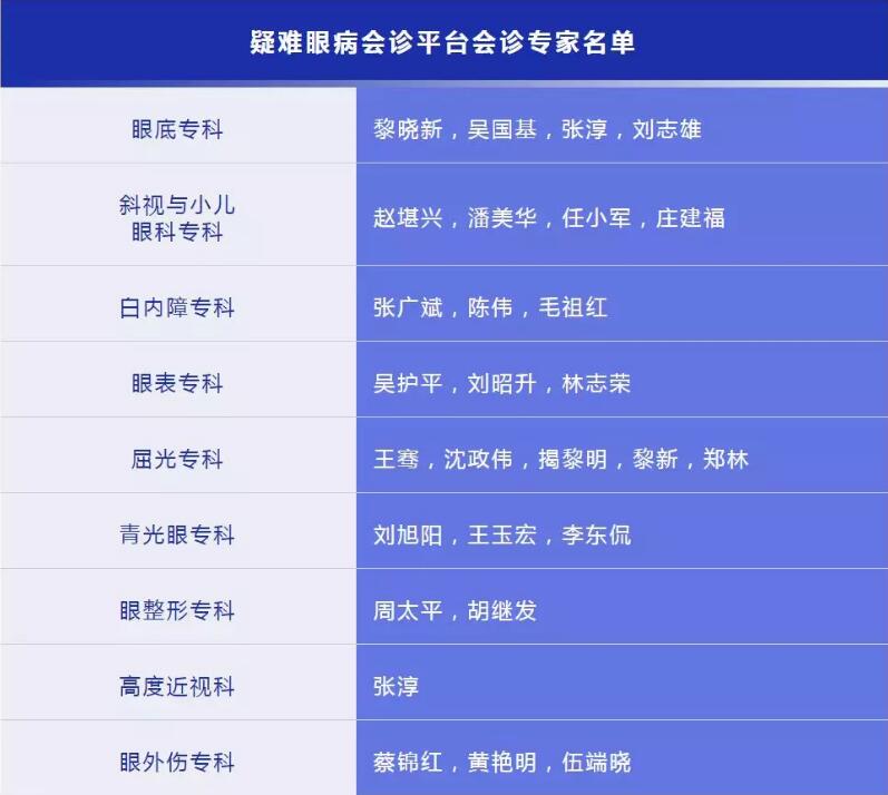 這是一個堪稱“夢之隊”的會診專家團隊,涵蓋眼底、斜視與小兒眼科、白內(nèi)障、眼表、屈光、青光眼、眼整形、高度近視、眼外傷等亞???。目前,中國大陸擁有5位國際眼科科學院院士,有兩位就在這個會診專家團隊中,分別是廈門大學附屬廈門眼科中心總院長黎曉新教授、華廈眼科專家委員會主席趙堪興教授。