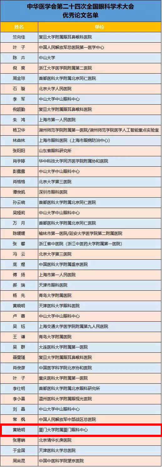 2019年9月8日上午,中華醫(yī)學(xué)會第二十四次全國眼科學(xué)術(shù)大會在蘇州國際博覽中心舉行閉幕儀式。廈門眼科中心眼外傷專科留美博士黃艷明主任發(fā)表的論文《21例眼球貫通傷眶內(nèi)金屬異物殘留術(shù)后長期隨訪觀察》被評為優(yōu)秀論文獎,福建省僅一篇入選。