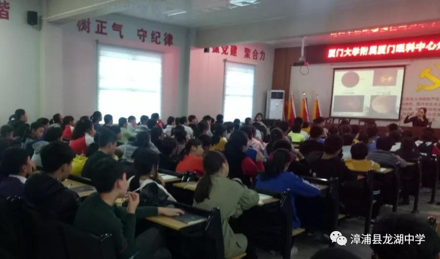 廈門大學(xué)眼科中心任小軍主任醫(yī)生擔(dān)任主講師,她通過近視成因、近視預(yù)防、近視矯正等幾個方面展開,引導(dǎo)同學(xué)們學(xué)習(xí)眼睛的相關(guān)知識,屈光不正,散光,近視等病例特征,以及如何去預(yù)防和控制等相關(guān)知識,提高了用眼常識。在眼科中心外聯(lián)部洪聰波主任和學(xué)校有關(guān)領(lǐng)導(dǎo)的共同努力下,活動取得良好的效果,同學(xué)們懂得了如何在平時生活中愛護自己的眼睛,有效防控近視。