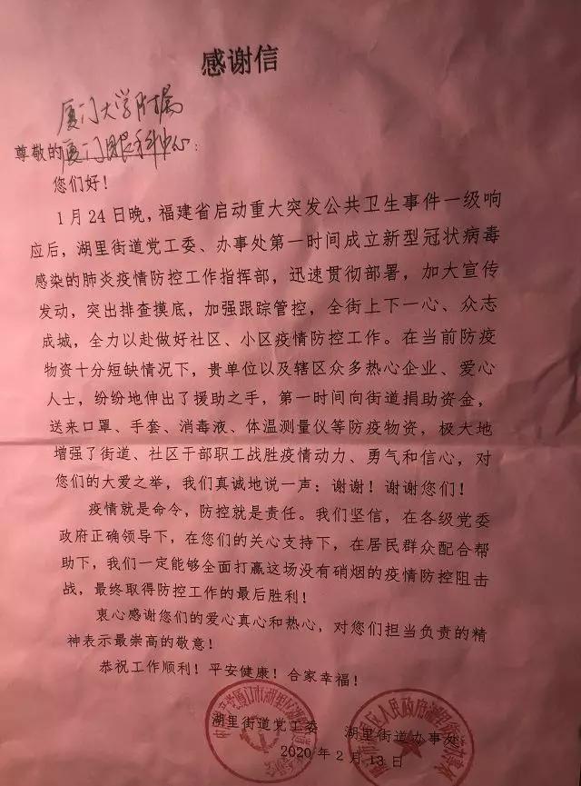 在中華街道辦,街道在LED大屏上打上了“感謝廈門大學(xué)附屬廈門眼科中心向中華街道捐贈護目鏡”;廈港街道辦為醫(yī)院頒發(fā)了榮譽證書;還有湖里街道辦、金山街道辦等街道也寫了一封封誠摯的感謝信。