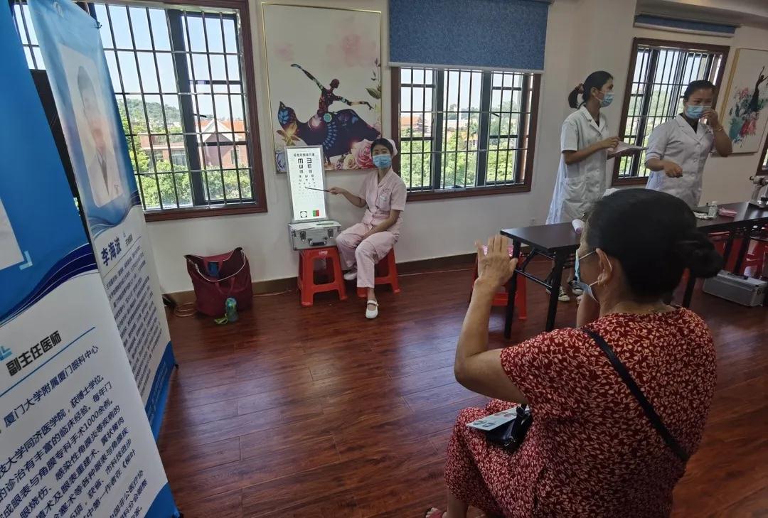▲廈門(mén)眼科中心護(hù)士為居民查視力