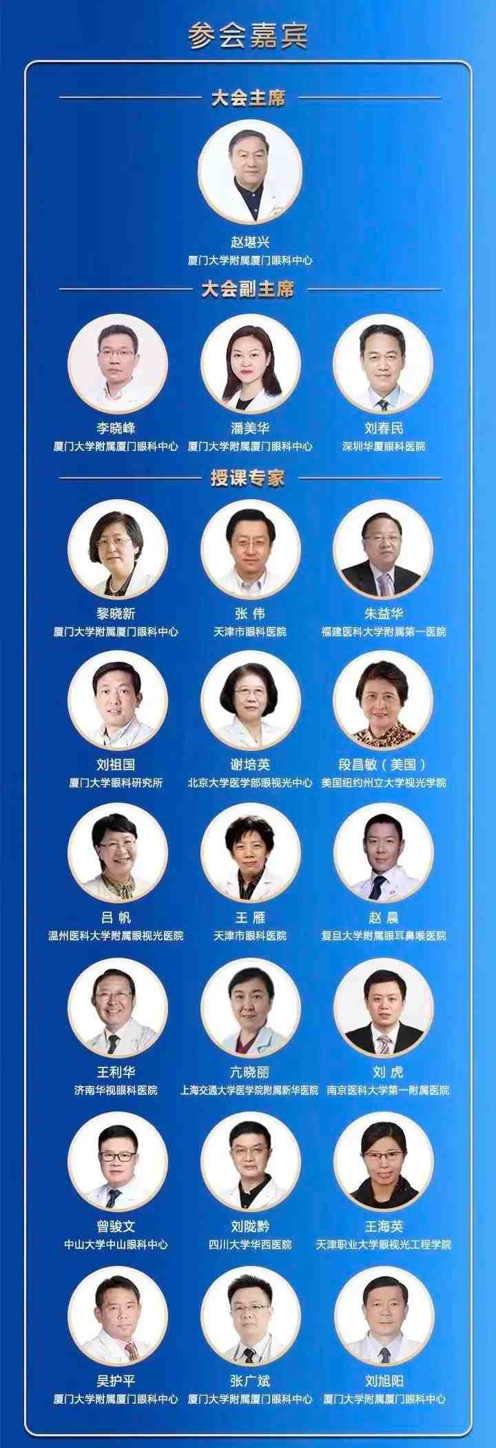 授課專家包括國(guó)際眼科科學(xué)院院士、亞太地區(qū)斜視與小兒眼科學(xué)會(huì)副主席趙堪興教授;國(guó)際眼科科學(xué)院院士、廈門眼科中心總院長(zhǎng)黎曉新教授;中華醫(yī)學(xué)會(huì)眼科學(xué)分會(huì)斜視與小兒眼科學(xué)組組長(zhǎng)張偉教授;中華醫(yī)學(xué)會(huì)眼科學(xué)分會(huì)眼視光學(xué)組組長(zhǎng)呂帆教授;以及朱益華教授、劉祖國(guó)教授、王利華教授、段昌敏教授(美國(guó))、謝培英教授、王雁教授、亢曉麗教授、趙晨教授、劉虎教授、劉隴黔教授、曾駿文教授、潘美華教授、張廣斌教授、吳護(hù)平教授、劉旭陽教授、王海英教授等重量級(jí)業(yè)界專家和講者。