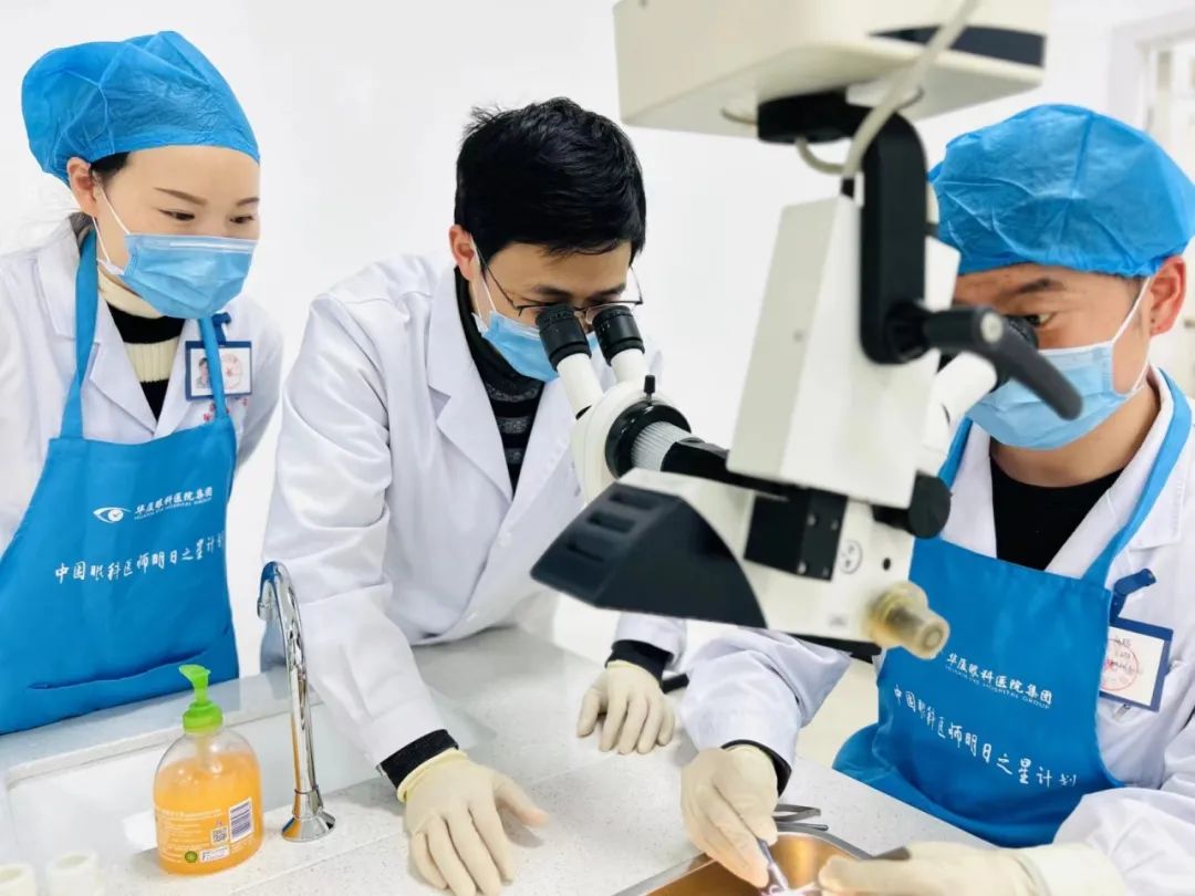 ▲修陽(yáng)暉(中)帶教中國(guó)眼科明日之星學(xué)員進(jìn)行動(dòng)物眼顯微手術(shù)操作