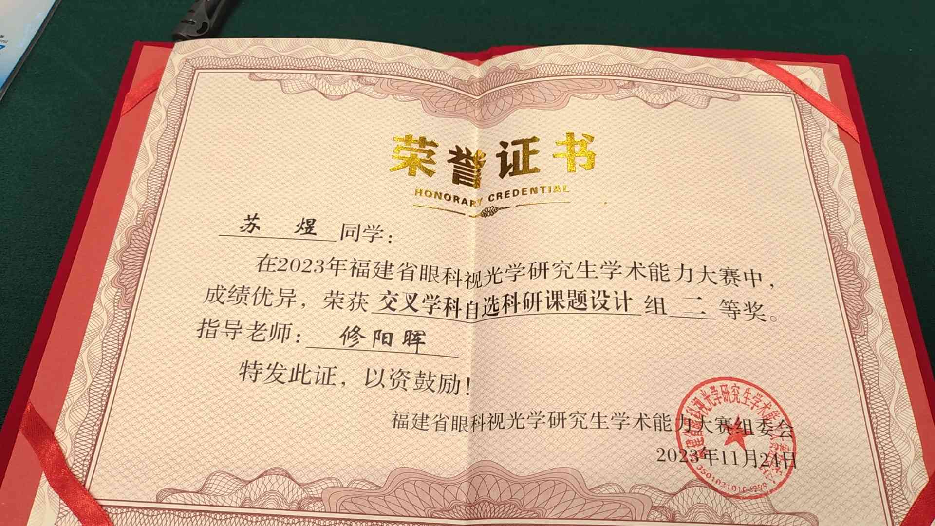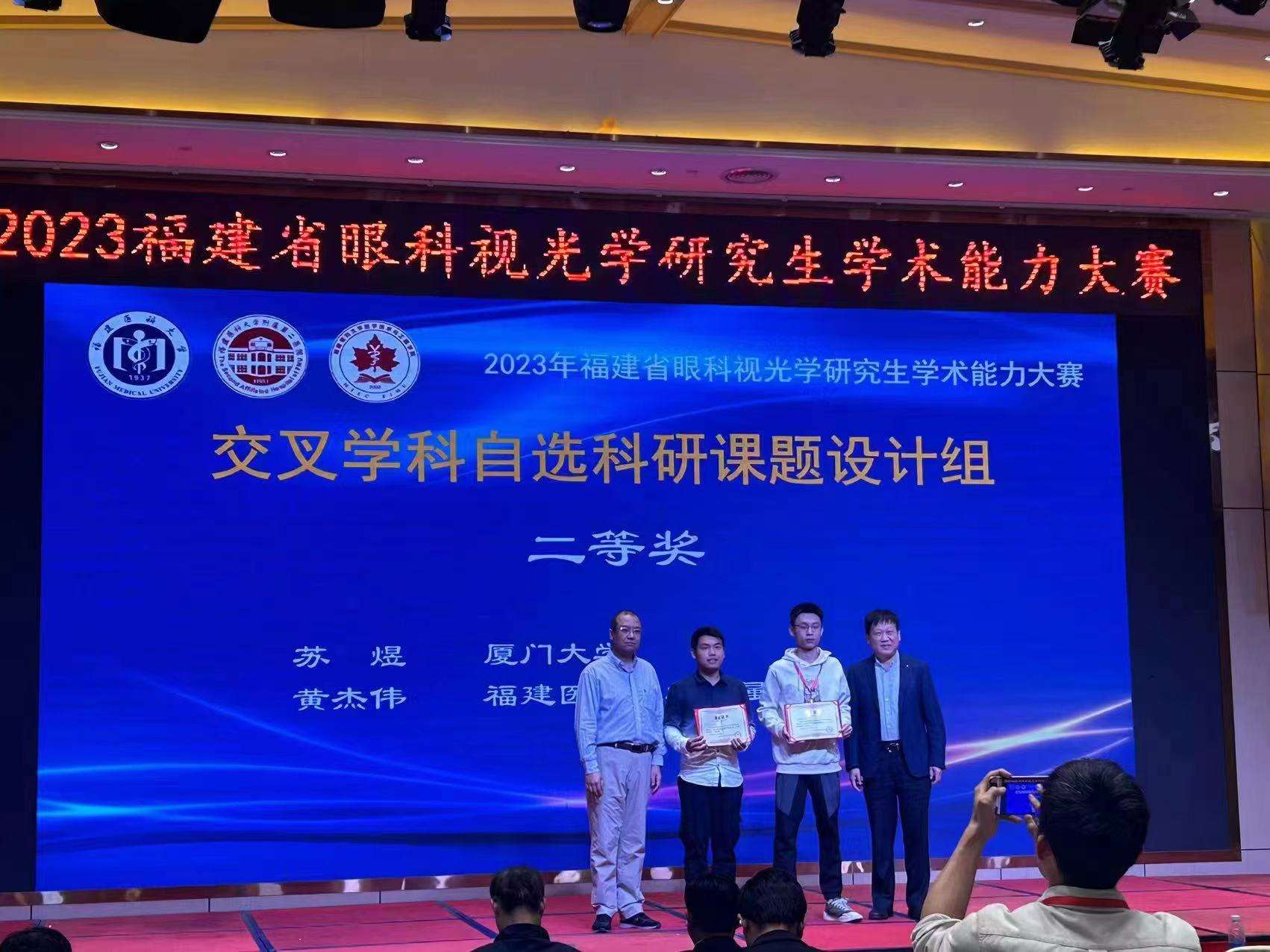 廈門眼科中心斜視與小兒眼病中心修陽(yáng)暉博士指導(dǎo)的2023級(jí)專業(yè)型碩士研究生蘇煜代表廈門大學(xué)參賽,以嚴(yán)謹(jǐn)?shù)目蒲兴悸放c臨床思維,展現(xiàn)出良好的精神風(fēng)貌和綜合素質(zhì),獲得在場(chǎng)的專家評(píng)委一致好評(píng),最終以總分全省第二的好成績(jī)斬獲“交叉學(xué)科自選課題組二等獎(jiǎng)”。