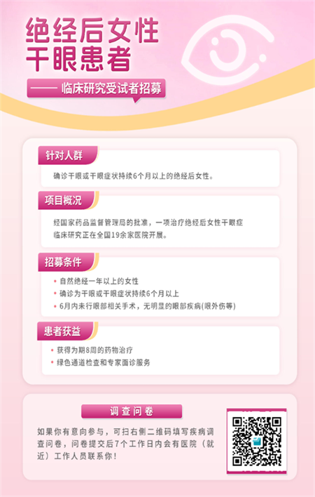 該項臨床研究的組長單位是廈門大學附屬眼科中心,主要負責人是劉祖國教授,針對的是確診干眼或干眼癥狀持續(xù)6個月以上的絕經(jīng)后女性。若符合招募條件,成功報名參與后您將獲得為期8周的藥物治療,以及綠色通道檢查和專家面診服務。