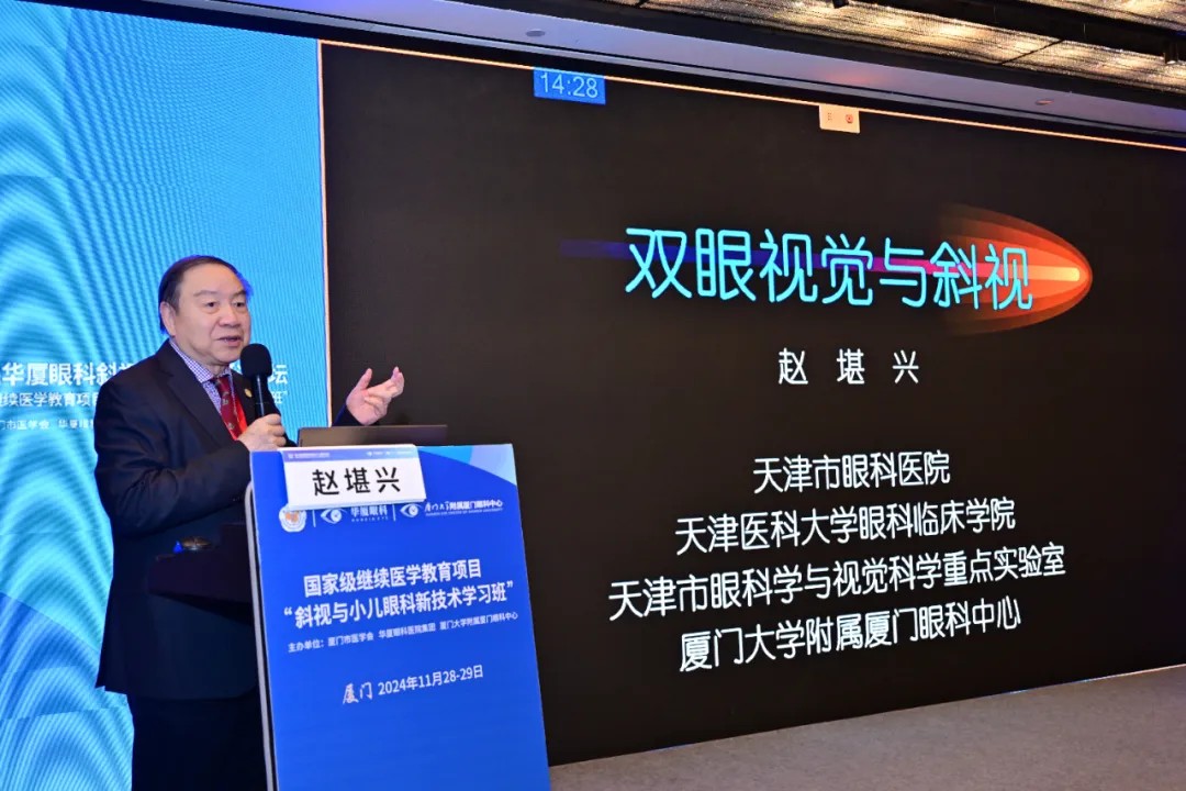 開幕式后,國際眼科科學(xué)院院士、華廈眼科醫(yī)院集團(tuán)專家委員會主席趙堪興教授及國際眼科科學(xué)院院士、廈門眼科中心總院長黎曉新教授率先開啟了精彩的專題學(xué)術(shù)分享。趙堪興教授以《雙眼視覺與斜視》為主題,深入講解了雙眼視覺的生理機(jī)制、發(fā)育及其障礙,提出在兒童眼疾的臨床診療過程中要結(jié)合雙眼視的實(shí)際情況詳細(xì)分析病情,明確診斷后進(jìn)行個(gè)性化診療。黎曉新教授以《雙側(cè)RB的第二只眼治療》為題,結(jié)合多個(gè)臨床案例,詳細(xì)介紹了視網(wǎng)膜母細(xì)胞瘤第二只眼的診療要點(diǎn)難點(diǎn)及治療方法,并分享了新技術(shù)“釕核素放射熱敷貼”對于RB第二只眼的治療效果。