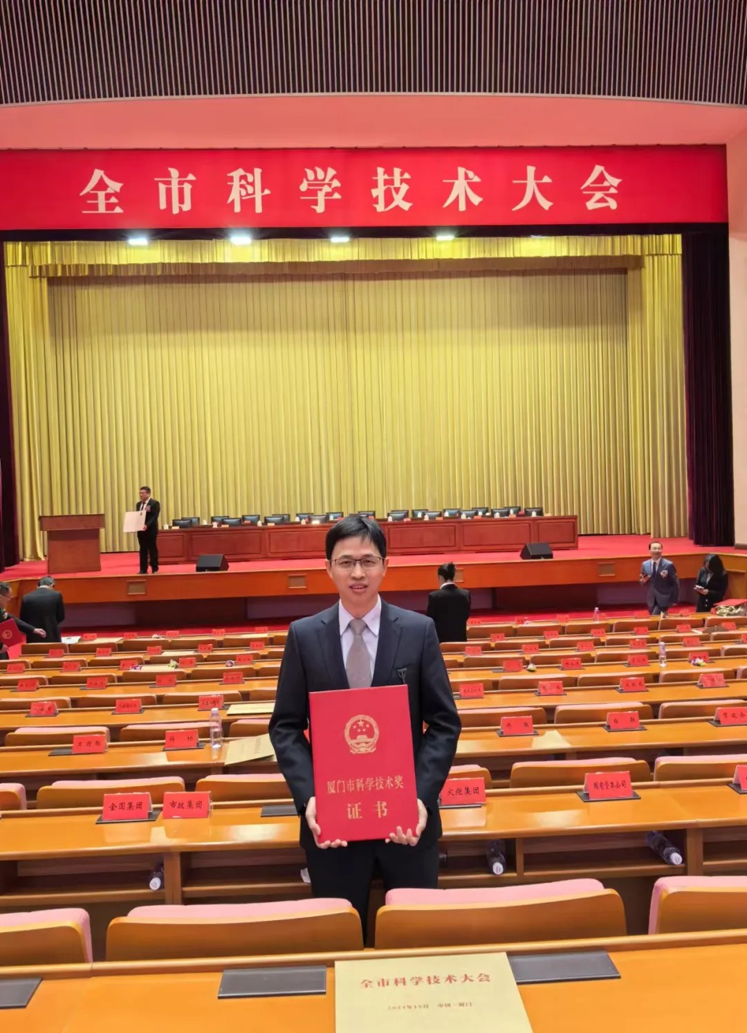 12月16日,廈門(mén)市科學(xué)技術(shù)大會(huì)在廈門(mén)人民會(huì)堂隆重舉行,大會(huì)現(xiàn)場(chǎng)為獲得2023年度廈門(mén)市科學(xué)技術(shù)獎(jiǎng)的科研人員代表頒獎(jiǎng)。由廈門(mén)眼科中心作為第一完成單位,斜視與小兒眼科修陽(yáng)暉博士、眼外傷及眼底2科李海波博士所在團(tuán)隊(duì)共同完成的“兒童眼健康防治體系的建設(shè)”項(xiàng)目喜獲廈門(mén)市科學(xué)技術(shù)進(jìn)步獎(jiǎng)三等獎(jiǎng),修陽(yáng)暉博士應(yīng)邀出席盛典并代表科研團(tuán)隊(duì)領(lǐng)獎(jiǎng)。