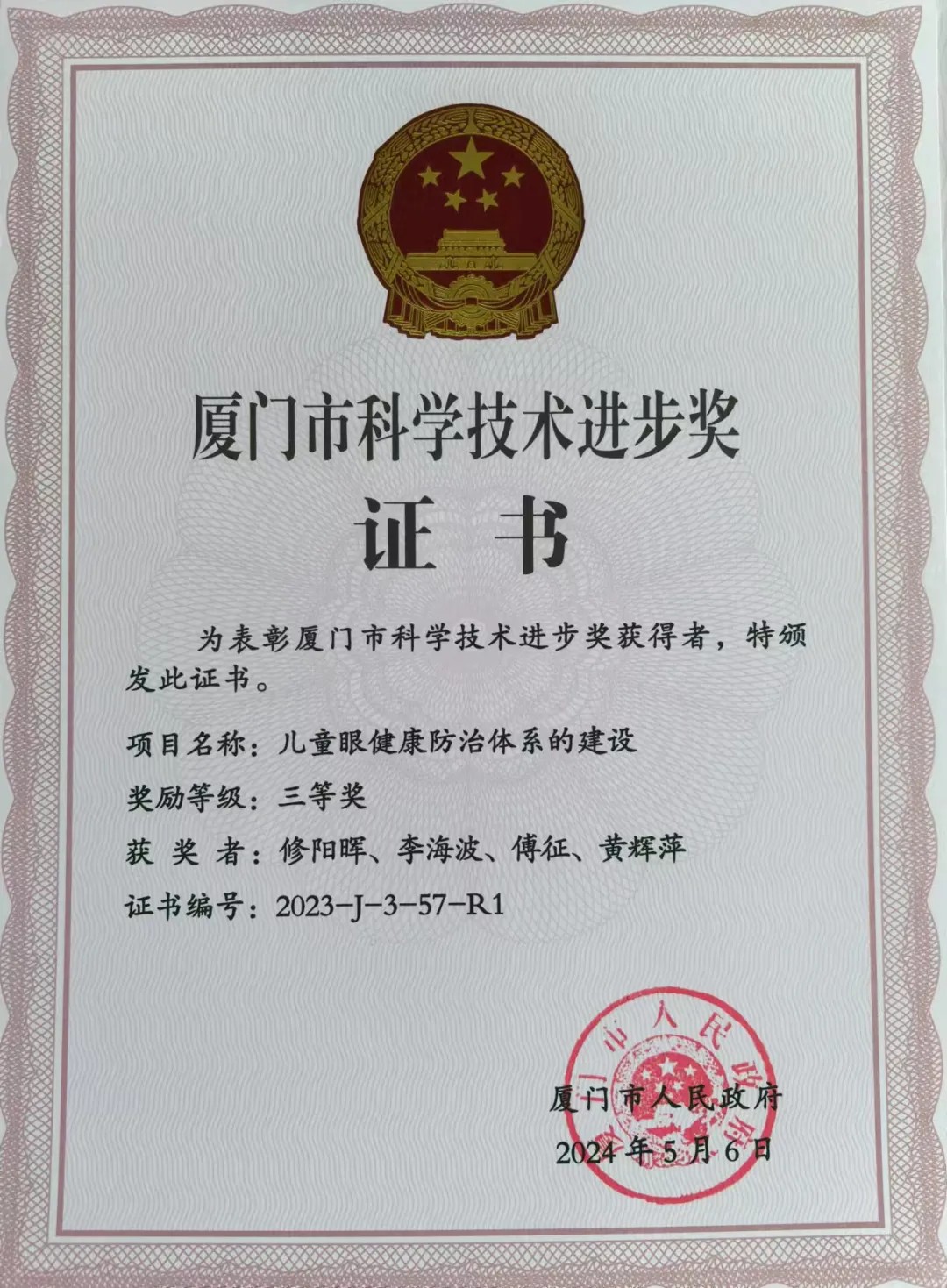 《廈門(mén)市科學(xué)技術(shù)進(jìn)步獎(jiǎng)》證書(shū)