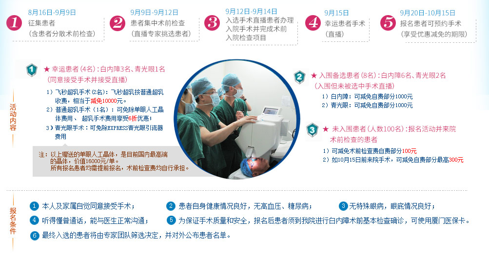 屆時(shí)受邀的國內(nèi)專家會在現(xiàn)場“傳道解惑”探討當(dāng)今眼科技術(shù)。研討會期間廈門大學(xué)附屬廈門眼科中心將面向社會大眾開放,全國眼病患者可先提前報(bào)名預(yù)約專家會診,屆時(shí)將有機(jī)會獲得免費(fèi)手術(shù)名額。幸運(yùn)獲獎(jiǎng)?wù)呖勺寚鴥?nèi)眼科專家為其免費(fèi)手術(shù),我院還將進(jìn)行實(shí)況手術(shù)直播,與國際眼科專家共同交流經(jīng)驗(yàn)。