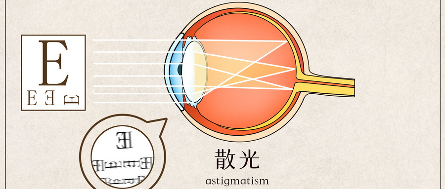 散光是眼睛的一種屈光不正常狀況,與角膜的弧度有關(guān)。通俗點(diǎn)講,人的眼睛像個(gè)圓球,若角膜各個(gè)方向的弧度一致,則沒有散光,物體在視網(wǎng)膜上成清晰的像。但有些人的角膜在某一角度區(qū)域的弧度較彎,而另一些角度區(qū)域則較扁平,就形成了散光,物體在視網(wǎng)膜上成模糊的像。是看物體的邊緣是虛化的,嚴(yán)重的散光甚至?xí)霈F(xiàn)重影,無論距離遠(yuǎn)近都很難看清楚。散光本身可以發(fā)展成近視,在近視中合并的散光又可以促進(jìn)近視發(fā)生、發(fā)展。
