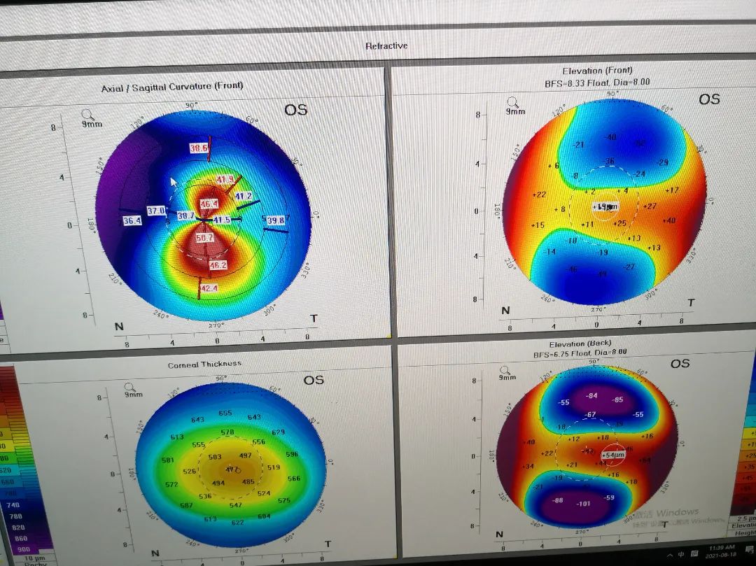 圓錐角膜早期病變表現(xiàn)為角膜表面異常隆起,角膜地形圖可以體現(xiàn)角膜表面形態(tài),它能夠精確測量分析全角膜表面任意點(diǎn)的曲率、厚度、形態(tài),及時發(fā)現(xiàn)角膜形態(tài)是否異常。