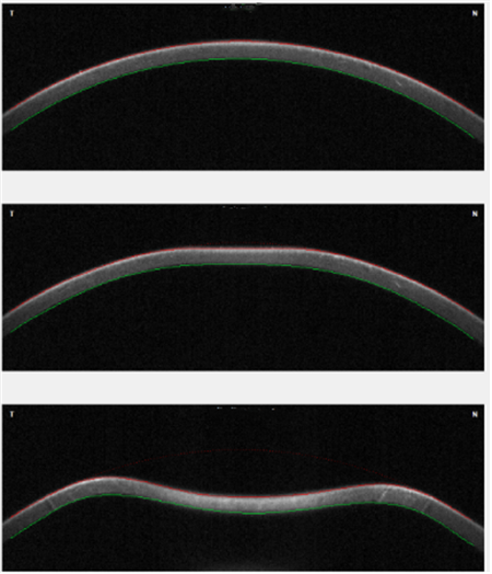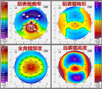 角膜地形圖可以精確分析角膜上任意地方的厚度、曲率等,觀察角膜前后表面曲率、瞳孔中心位置、角膜頂點和最薄點厚度,及時發(fā)現角膜的形態(tài)是否發(fā)生了變化。
