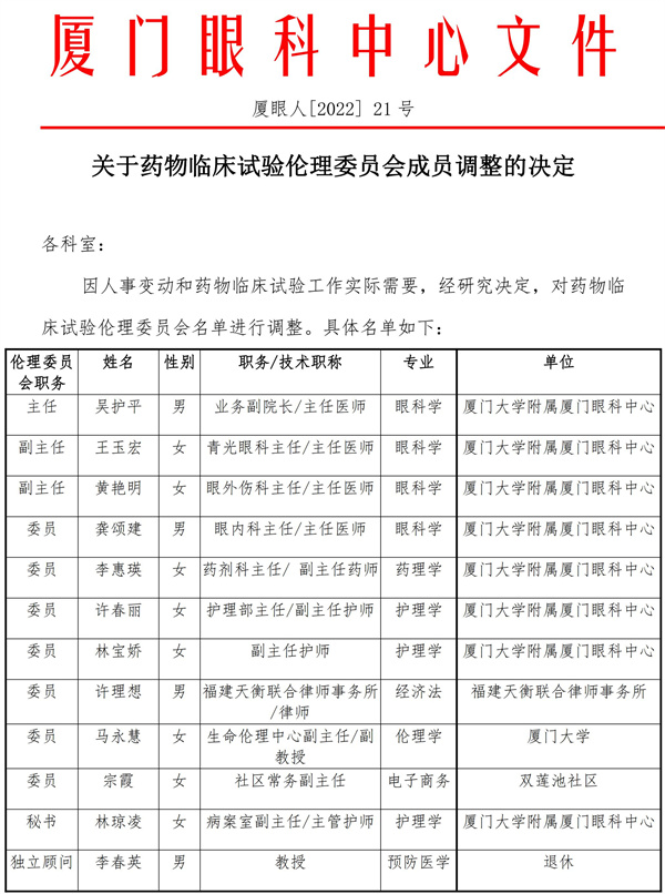 【文章導(dǎo)讀】因人事變動和藥物臨床試驗(yàn)工作實(shí)際需要,經(jīng)研究決定,對藥物臨床試驗(yàn)倫理委員會名單進(jìn)行調(diào)整……
